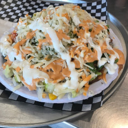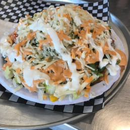 One of the highlights on their menu is the Large Nachos, which are perfect for sharing and feature homemade lime-seasoned corn chips topped with sautéed fajita peppers and onions, beans, and your choice of veggies or proteins. Each serving is garnished with homemade salsa, cheese, and their own homemade sour cream. The vegetarian guacamole is a must-try as well.